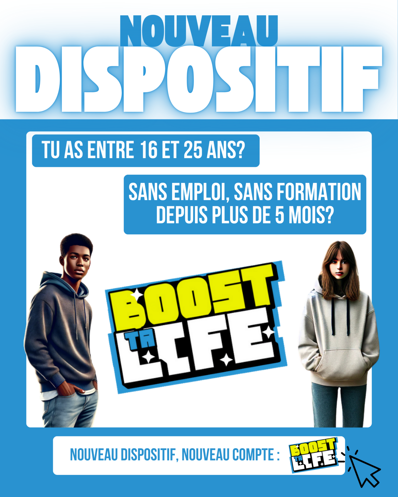 Tu as entre 16 et 25 ans, sans emploi ni formation, et tu cherches un coup de pouce pour avancer ? Bonne nouvelle : nous lançons BOOST TA LIFE, un programme conçu pour t’aider à trouver ta voie, te former et construire ton projet pro !